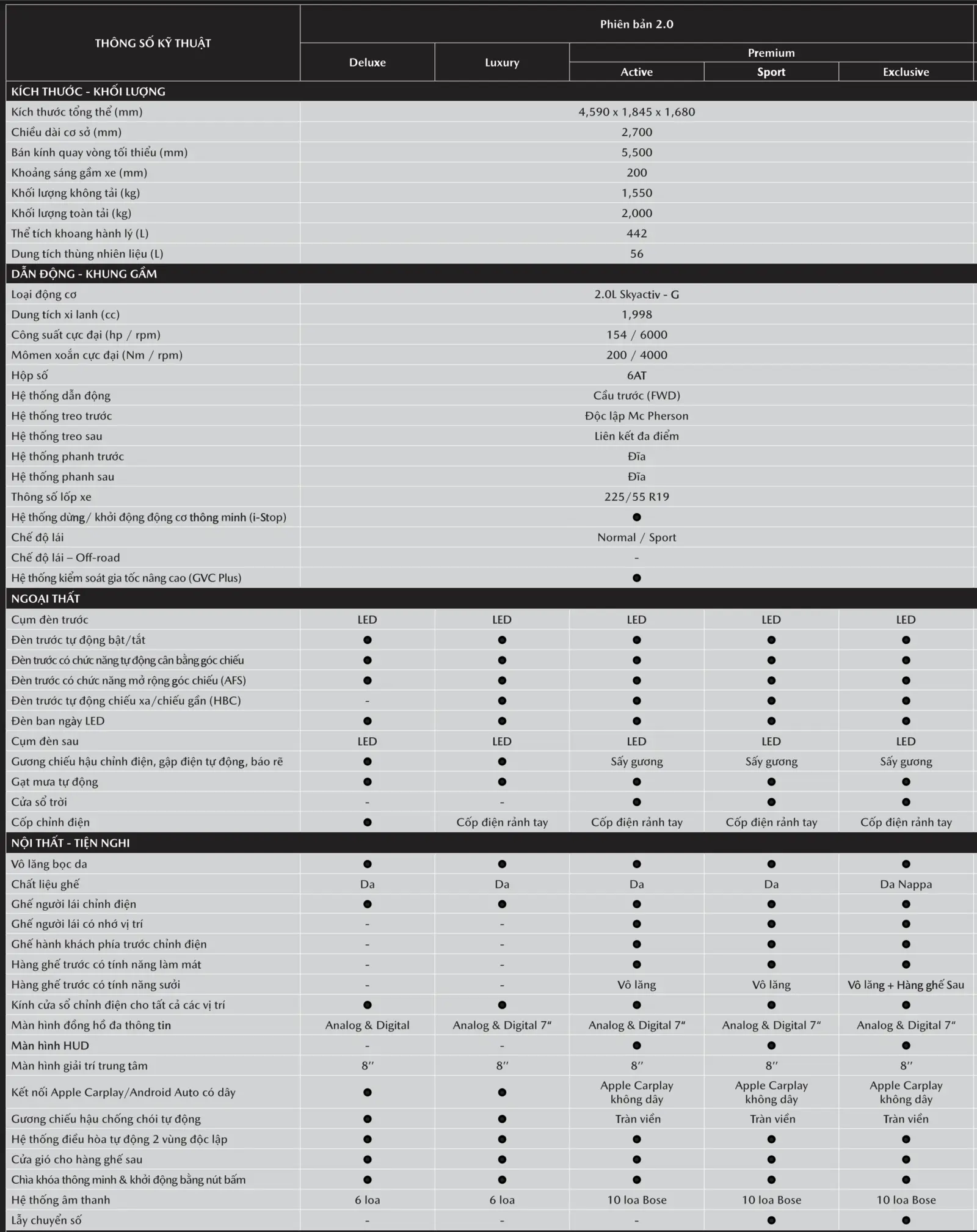 Kích thước tổng thể của New Mazda CX5 Deluxe 2025 là 4,590 x 1,845 x 1,680 mm mang thiết kế là một mẫu xe SUV cỡ C với 5 chỗ ngồi. New Mazda CX5 Deluxe 2025 sở hữu chiều dài cơ sở của xe 2,700 mm, bán kính quay vòng của xe 5.50 & khoảng sáng gầm của xe 200 mm. New Mazda CX-5 có thay đổi chiều dải tổng thể khi tăng 40mm, chiều rộng tăng nhẹ 5mm.